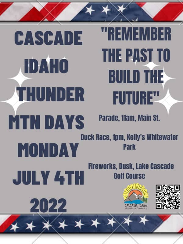 Buckaroo Breakfast: 7 a.m. Masonic Lodge, 216 S. Main Street Face painting at Squirrel Outdoors: 10 a.m.–11 a.m. and 12 p.m.-3 p.m. Parade: 11 am, Main Street, Cascade Duck Race: 1 p.m. Kelly’s White Water Park Fireworks: Dusk, over Lake Cascade
